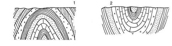Складчатые дислокации:1 – антиклиналь, 2 – синклиналь