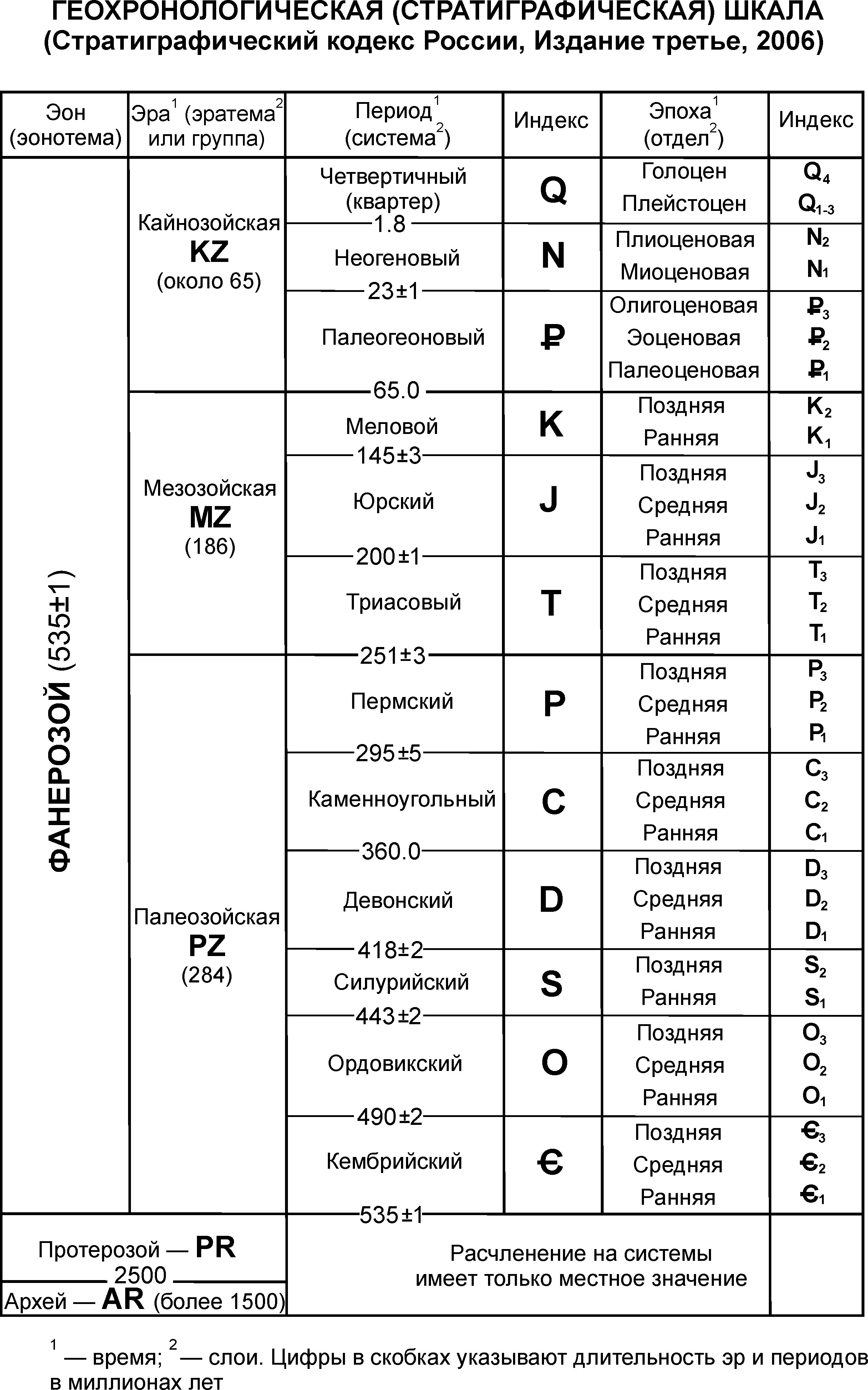 Периоды делят на эпохи(отделы), например, триасовый подразделяют на нижнюю Т1,среднюю Т2 и верхнюю Т3.Каждую эпоху разделяют на века(ярусы) ,например К2 dat читается как меловой период, средняя эпоха, датский век. . Верхний индекс дает наименование века. Современный четвертичный период имеет деление на эпохи , обозначенные римскими цифрами QI, QII,QIII QIV.Кроме того перед индексом Q ставят знаки, обозначающие генезис(происхождение пород),A QIII–породы аллювиального (речного) отложения,eoQII – породы эолового (ветрового) генезиса, mQI- морского происхождения.