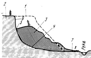 Пунктирым указано первоначальное положение крутого берегового склона. После оползня он принял совсем иную форму, представленную сплошной линией. Во всяком оползневом склоне можно выделить отдельные элементы его.