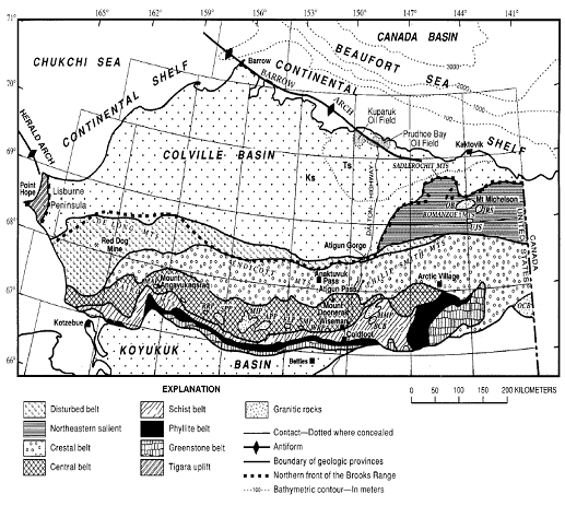 юрско-среднемеловой ороген хребта Брукса и верхнемеловой бассейн Колвилл.