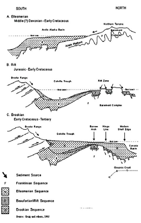 Северная Аляска и прилегающий континентальный шельф представляют часть большого бассейна, некогда протягивавшегося через единый континент. Этот единый континент был расколот в раннем мезозое на несколько фрагментов, которые были разъединены расширяющимся Арктическим океаном. Этот гипотетический континент известен под разными названиями - Гиперборея, Древняя Арктика, Арктида. Породы, слагавшие бассейн до раскола континента, известны под названием элсмирский комплекс. Они залегают на интенсивно деформированных породах девонского и более древнего возраста, известных как франклинский комплекс. Раскол древнего континента, являющегося источником осадков элсмирского комплекса, маркируется более молодыми осадками. Они отлагались в своеобразных рифтовых зонах, вдоль которых континент был разобщен на несколько фрагментов. Эти отложения выделяют как рифтовый комплекс, им же соответствуют отложения бофортского комплекса. Этим отложениям соответствует возрастной интервал около 175 до 115 млн лет.