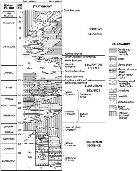 Общая мощность фанерозойских образований в бассейне Арктического склона Аляски достигает 7-8 км. Породы фундамента в этом районе сильно дислоцированы, толща осадочных образований залегает на них с резким несогласием. Осадочный чехол подразделяется на два комплекса, слагающих два самостоятельных этажа, которые разделены стратиграфическим и угловым несогласием.