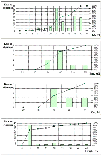 Распределения петрофизических и литологических параметров, построенных по этой