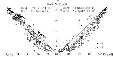 Зависимость остаточной водонасыщенности Кво от пористости Кп для пластов группы ПК (рис. 2.3а) практически невозможно проанализировать из-за малой выборки керновых исследований с замерами Кп и Кво.