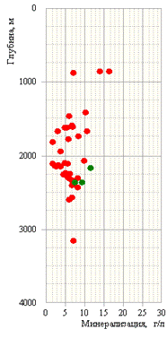 Изменение минерализации пластовых вод с глубиной для Западно- и Восточно-Мессояхского месторождений приведено на рисунке 2.9. При построении рисунка использованы сведения по минерализации пластовых вод пластов групп ПК, МХ, БУ, Ю. Для Западно- и Восточно-Мессояхского месторождений минерализация пластовых вод изменяется от 16 г/л в сеноманском водоносном комплексе до 7 или 8 г/л для юрских отложений.