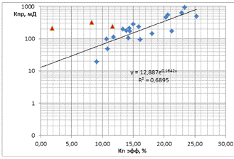 При оценке граничных признаков коллекторов использовался и петрофизический способ с помощью связей типа «керн-керн»: Кп=f(Кп эф), Кпр=f(Кп эф), Кво=f(Кпр).