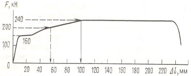 Допустимое удлинение, когда при дальнейшей нагрузке несущая способность анкера увеличивается, составляет 4 %. В этом случае достигнуто напряжение в штанге между пределом текучести и пределом прочности. Пологая часть характеристики, когда дальнейшее увеличение длины происходит без увеличения нагрузки, характеризуется как критическое, т.е. критическое удлинение 7 %.
