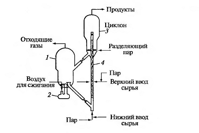 Пары продуктов крекинга и непревращенное сырье после отделения катализатора в циклонах (сепараторы) разделяют в ректификационной колонне, из которой в систему возвращается шлам - смесь тяжелых фракций с катализатором. Отработанный катализатор с потоком воздуха поступает в отпарную секцию, где с поверхности катализатора отдувают десорбиро-ванные и увлеченные потоком углеводороды. Обработанный паром катализатор с потоком воздуха поступает в регенератор, где при 670-770°С производится выжигание кокса в кипящем слое. Время регенерации - от 5 до 15 мин. Регенерированный катализатор снова поступает на смешение с сырьем и таким образом цикл замыкается.
