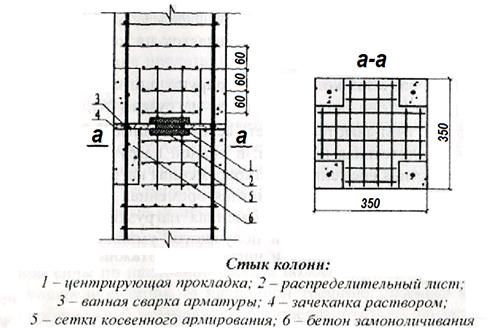 Концы колонны усиливают сварными сетками косвенного армирования, т.к. продольная арматура колонн в зоне стыка обрывается.