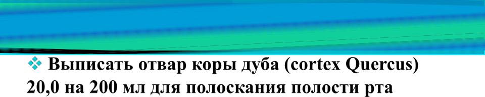 Выписать настой цветков ромашки (floes Camomille ) из расчета 1:20 для полоскания полости рта
