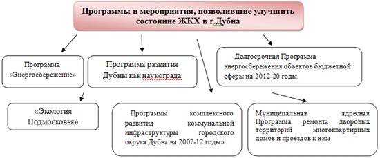 Для осуществления всех вышеперечисленных мероприятий администрацией г. Дубна Московской области был разработан ряд программ, в рамках которых удалось улучшить состояние жилищно-коммунального комплекса, а также реализовать ранее запланированные меры (см. рисунок 3).