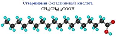 В углеродной цепи стеариновой кислоты отсутствуют изгибы, поэтому ее молекулы способны к плотной параллельной укладке.