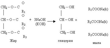 Реакция гидролиза в присутствии щелочи (омыления) широко используется для приготовления бытовых и медицинских мыл, а также для выяснения состава жиров и их доброкачественности. С этой целью определяют число омыления, то есть количество миллиграммов едкого калия (KOH), необходимое для нейтрализации свободных и связанных в виде триглицеридов жирных кислот, содержащихся в 1 г жира.