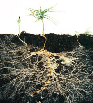 гифальный фронт контактирует с развивающимися сеянцами сосны, находящимися слева и справа от более зрелой особи, и начинает формирование микоризы, включая новые растения в общую мицелиальную сеть