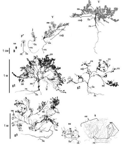 Условные обозначения: ГК – главный корень; БК – боковые корни; ПК – придаточные корни; СПФ – система побегов формирования; ПФ – побеги