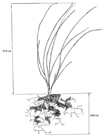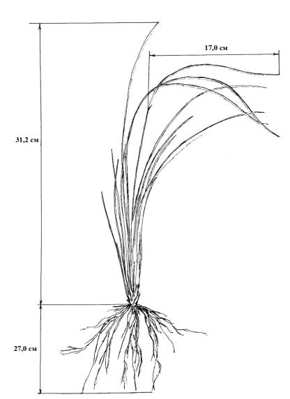 ВИРГИНИЛЬНЫЕ растения представляют собой хорошо развитую компактную дерновину диаметром около 15,0 см, что обусловлено одновременным кущением нескольких побегов II–III порядков. Отрастание листьев начинается в апреле. Длина листа 20,0–25,0 см. Дерновина имеет сравнительно мощную корневую систему. Корни разные по возрасту (Кирик, Гегучадзе, 2001). В этом состоянии растения вегетируют