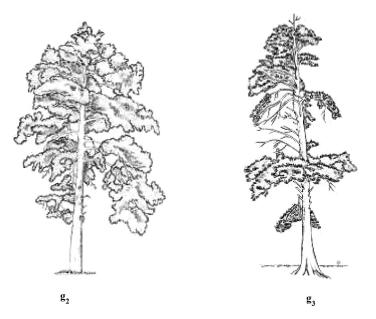 Рис. 3. Онтогенез сосны обыкновенной (Pinus sylvestris L.) (окончание): g2 – средневозрастное генеративное растение; g3 – старое генеративное растение