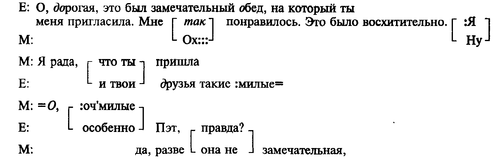 Никакая часть разговора не является законченным высказыванием. Обе перебивают друг друга, говорят одновременно, оставляют слова “висеть в воздухе”.