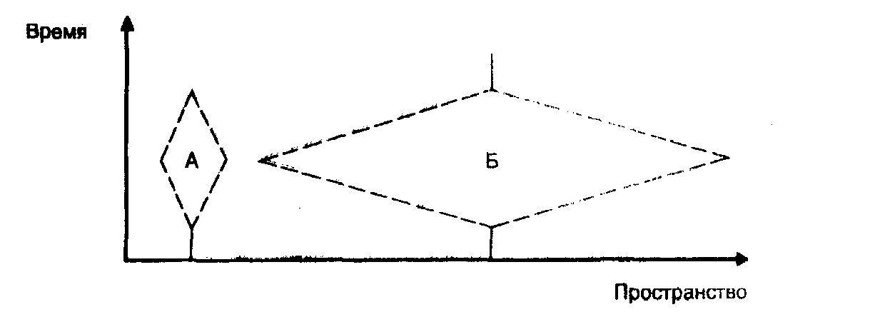 Рис.3. Возможный радиус пространственной мобильности в течение дня. Ромб А обозначает культуру, в которой физическое перемещение зависит от пешей ходьбы. Ромб Б обозначает культуру, использующую для транспортировки домашних животных Источник: Carlstein Т. Time resources, society and ecology: on the capacity for human Interaction In space and time. London. 1983. P. 75