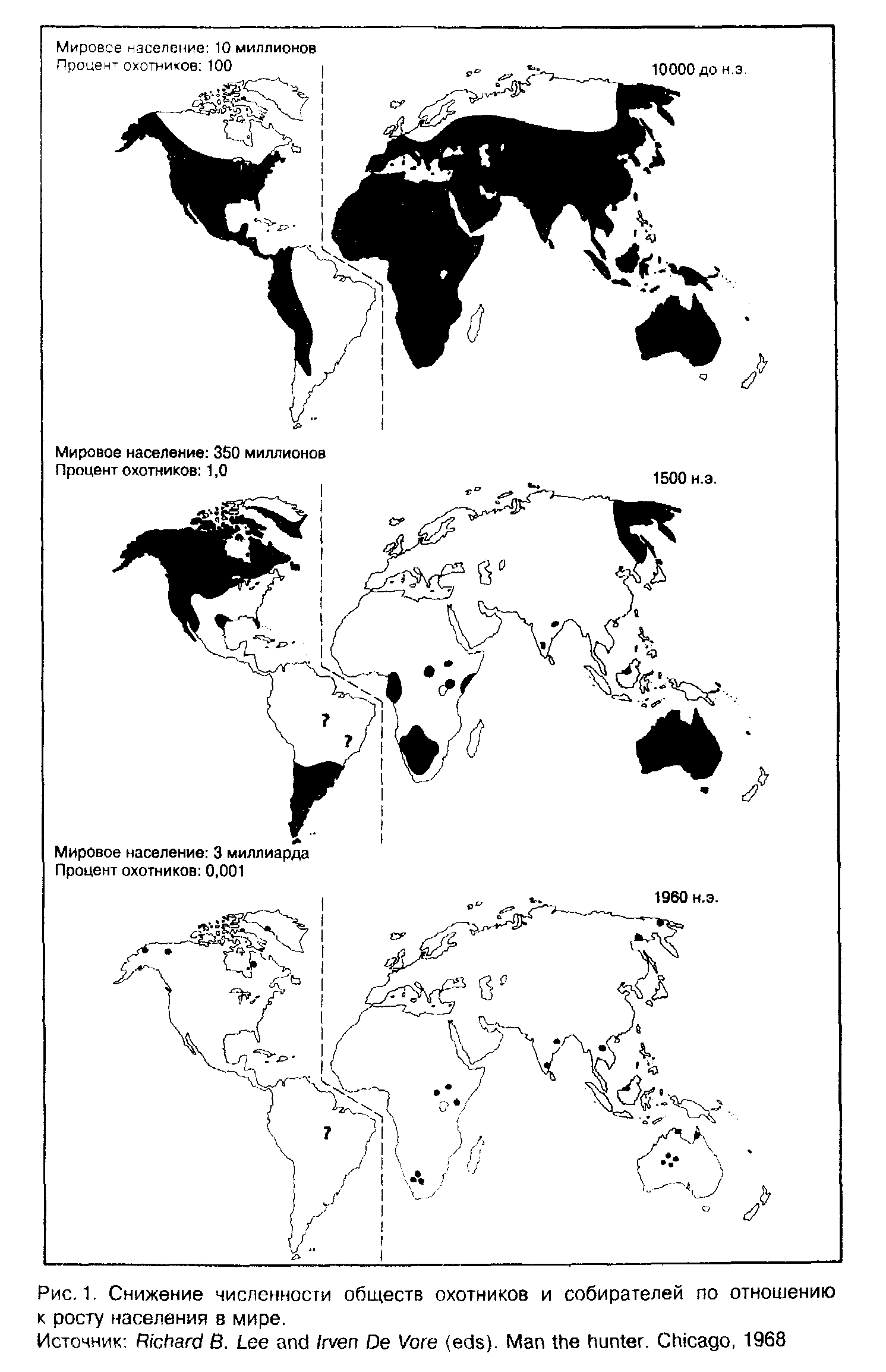 В течение всего нашего существования (за исключением очень короткого периода) на этой планете люди жили небольшими группами или племенами, численность которых не превышала тридцать-сорок человек. Человеческие общества самого раннего типа состояли из охотников и собирателей. Средства к существованию они получали не от возделывания сельскохозяйственных культур и разведения скота, а от охоты, рыболовства и сбора диких съедобных растений. В некоторых районах мира культуры охотников и собирателей существуют и сегодня, например, (54стр) в джунглях Бразилии и Новой Гвинеи, но большая их часть была уничтожена, либо ассимилировалась в ходе глобального распространения западной культуры. Оставшиеся культуры вряд ли долго сохранятся нетронутыми16). Сейчас всего лишь четверть миллиона человек существует за счет охоты и собирательства — это лишь 0,005% от всего населения земного шара.