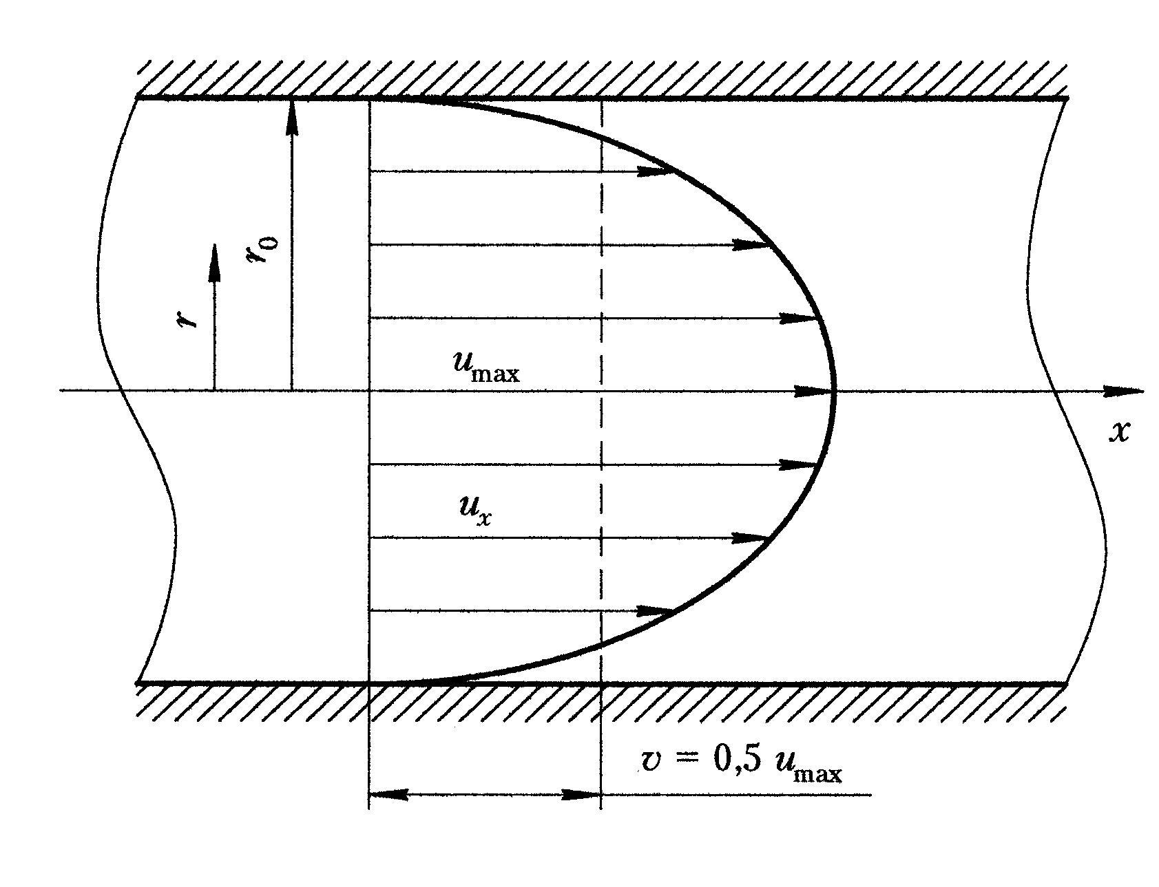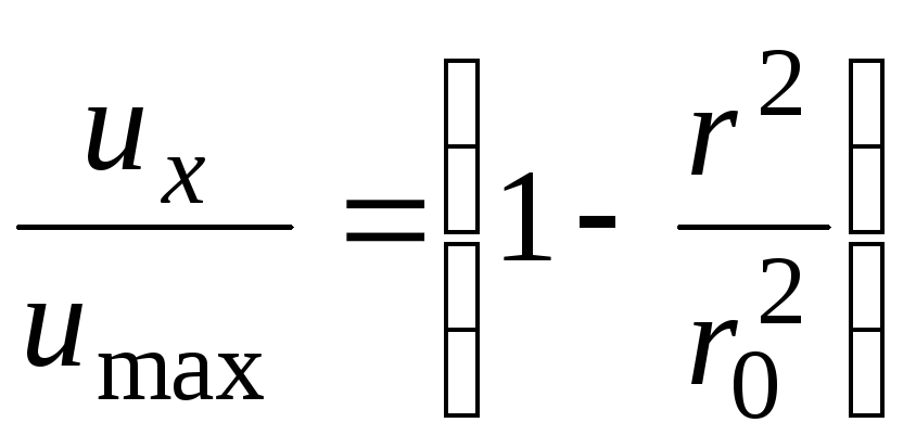 Таким образом, при ламинарном режиме течения профиль скорости по сечению потока имеет вид квадратичной параболы (см. рис. 2.32).