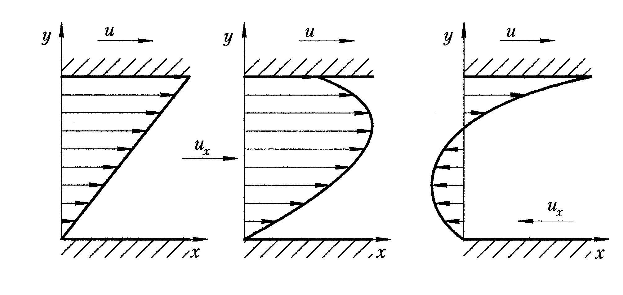 Рис. 2.35. Схема движения Куэтта при различных градиентах давления:
