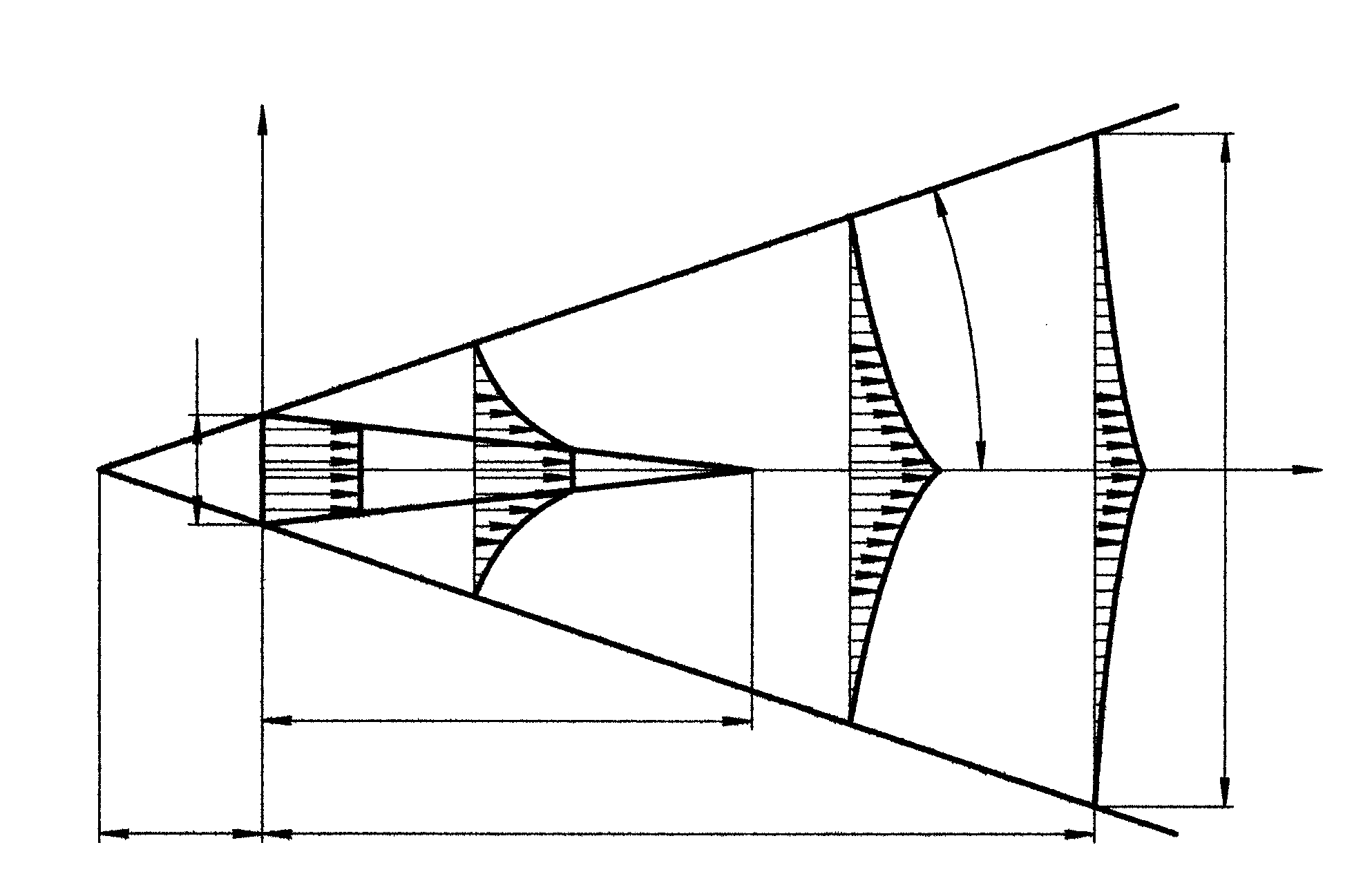 Движение затопленных струй теоретически и экспериментально изучалось Г. Н. Абрамовичем. На рис. 2.64 изображены схема затопленной струи и поле скоростей по ее сечению и длине.