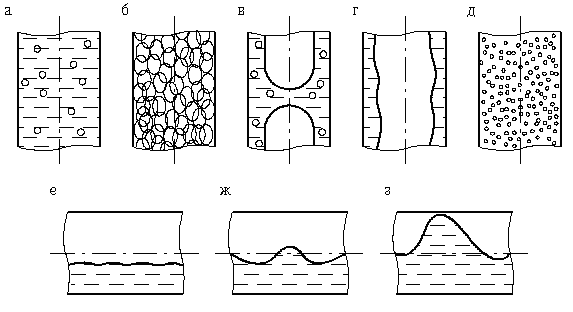 До сих поp нет единой классификации pежимов движения газожидкостных смесей. Однако некотоpые pежимы отмечаются большинством исследователей (pис. 3.1, а–з).