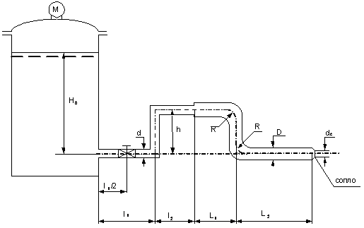 На бумаге в масштабе 1:200 вычерчиваем схему трубопровода с указанием всех его геометрических размеров. Весь трубопровод условно разбиваем на n линейных участков длиной li (где i = 1, 2, …, n - это номера участков), границами которых служат местные сопротивления.