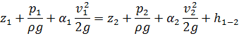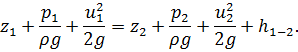 где z1, z2 - расстояния от плоскости сравнения до центра тяжести;иp2 - давления в сечениях 1-1 и 2-2 соответственно;, u2 - истинные скорости; ,v2 - средние скорости в этих сечениях;