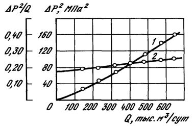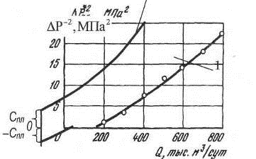 Зная коэффициенты фильтрационных сопротивлений, по значению "а" можно вычислить газопроводность kh/m, по значению "в" - коэффициент макрошероховатости l*. Следует только помнить, что на практике давление измеряют в МПа, дебит - в тыс. м3/сут; отсюда размерность коэффициента "а" - МПа2/(тыс.м3/сут.), коэффициента "в" - [МПа/(тыс.м3/сут.)]2. При вычислении kh/m и l* размерности "а" и "в" должны быть приведены к системе СИ.