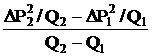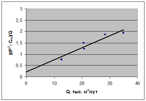 Строят график в координатах DР2/Q от Q, который представляет собой прямую линию. Отрезок, отсекаемый на оси ординат, есть коэффициент "а", а коэффициент "в" определяется как уклон построенной прямой. При вычислении коэффициента "в" нельзя использовать фактические точки, а следует взять две произвольные точки на уже построенной прямой (рисунок 8):