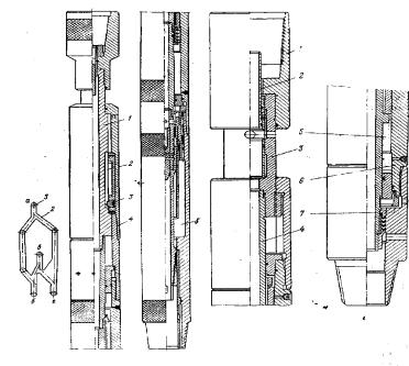этого пакерующий элемент деформируется. Шток испытателя пластов перемещается вниз из положения б в положение в (см. рис.3.3.4, а) и сдвигает центральную втулку 2 (см. рис.3.3.4, б), которая перекрывает боковые отверстия в верхнем штоке З уравнительного клапана. При подъеме штока (из в в г) и последующем спуске из положения г (см. рис.3.3.4, а) в положение а открывается приемный клапан испытателя пластов. Для закрытия приемного клапана и обеспечения закрытого периода испытания инструмент приподнимают, шток свободно перемещается в положение б, при этом резко возрастает нагрузка на инструмент, так как натяжение инструмента через сухари передается на корпус испытателя пластов. Это является сигналом на поверхность к прекращению подъема инструмента и его опускают в положение в.