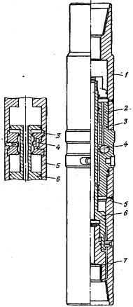 Испытатель пластов (рис.3.3.4, а) имеет специальную камеру 5. через которую происходит приток пластовой жидкости в трубы, а при закрытии приемного клапана в конце испытания в ней поднимают пробу пластовой жидкости, т.е. она выполняет функцию пробоотборника. На верхнем штоке 1 имеется фигурный паз 2, по которому скользит сухарь 3, закрепленный в верхнем переводнике 4 испытателя пластов. Уравнительный клапан (рис.3.3.4, б) конструктивно весьма сложен. Он состоит из верхнего переводника 1 с центральной втулкой 2; верхнего 3 и нижнего 4 штоков; тормозной камеры 5, корпуса 6 и нижнего переводника 7. Поршень в тормозной камере установлен таким образом, чтобы обеспечивалось торможение штока при его движении вверх.