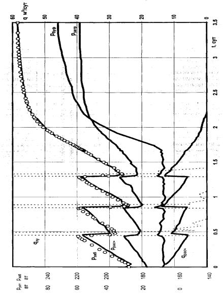 Рассмотрим на примере одной из добывающих скважин использование метода наилучшего совмещения для обработки кривой произвольного изменения забойного давления. В скважине 3100, рисунок 4.2.1, в течение 40 часов проводились наблюдения за естественным режимом работы. Происходило периодическое фонтанирование со временем перелива 1 час и временем подъема уровня - 9 часов. После очередного подъема жидкости до устья скважина была закрыта для регистрации КВД.