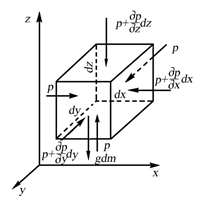Рассмотрим установившийся поток идеальной жидкости, которая движется без трения, т. е. не обладает вязкостью. Выделим в потоке элементарный параллелепипед объемом dV = dx dy dz, ориентированный относительно осей координат (см. рис. 1.3).