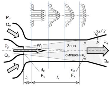 где lк - длина камеры смешения (КС); lс - расстояние от КС до сопла; ????д - угол раскрытия; nд - угол уширения диффузора; Рр - давление, подаваемое насосом; Qp - расход активной струи; Рn - давление на входе подсасываемой жидкости, Рв - на выходе из эжектора; Fk и Fc - соответственно площади сечений в конце КС и среза сопла; Wс - скорость истечения струи; dc - диаметр среза сопла