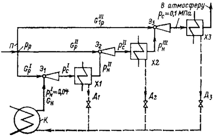 Э1-Э3 - струйные эжекторы соответственно первой, второй и третьей ступеней; X1 - ХЗ - холодильники соответственно первой, второй и третьей ступеней; К - конденсатор, из которого отсасывается паровоздушная смесь; П - коллектор рабочего пара; Д1-Д3 - дренажи конденсата из холодильников соответственно первой, второй и третьей ступеней.