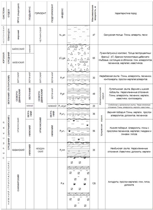 В геологическим строении района работ представлены отложения вендского, девонского, каменноугольного, пермского, неогенового (Таблица 1) и четвертичного возрастов. На дневную поверхность коренные отложения не выходят, так как перекрываются четвертичными отложениями. Характеристика геологического разреза приводится до глубины залегания сакмарского яруса нижнего отдела пермской системы, так как он является региональным водоупором, разделяющим зоны активного и замедленного водообмена.