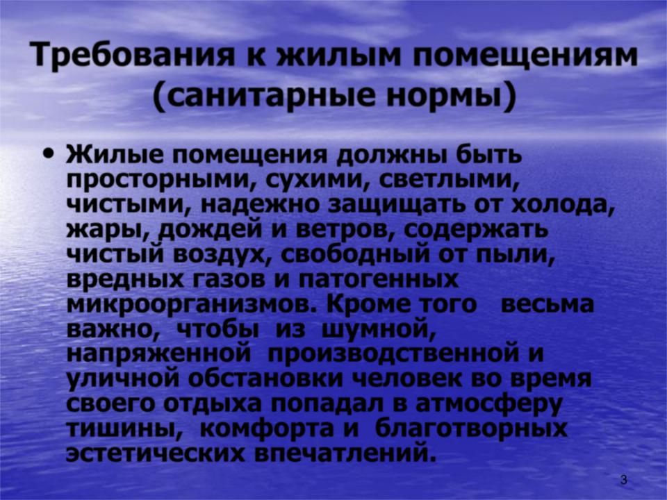 •Жилые помещения должны быть просторными, сухими, светлыми, чистыми, надежно защищать от холода, жары, дождей и ветров, содержать чистый воздух, свободный от пыли, вредных газов и патогенных микроорганизмов. Кроме того весьма важно, чтобы из шумной, напряженной производственной и уличной обстановки человек во время своего отдыха попадал в атмосферу тишины, комфорта и благотворных эстетических впечатлений.
