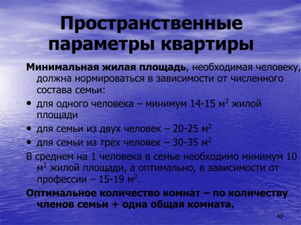 Всреднем на 1 человека в семье необходимо минимум 10 м2 жилой площади, а оптимально, в зависимости от профессии – 15-19 м2.
