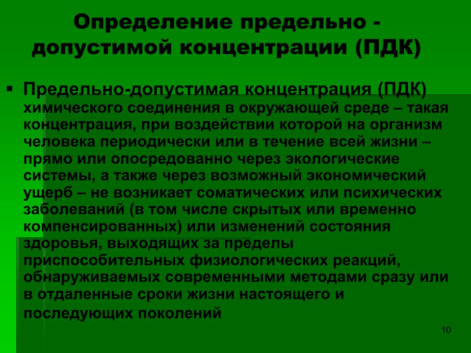 химического соединения в окружающей среде – такая концентрация, при воздействии которой на организм человека периодически или в течение всей жизни – прямо или опосредованно через экологические системы, а также через возможный экономический ущерб – не возникает соматических или психических заболеваний (в том числе скрытых или временно компенсированных) или изменений состояния здоровья, выходящих за пределы приспособительных физиологических реакций, обнаруживаемых современными методами сразу или в отдаленные сроки жизни настоящего и