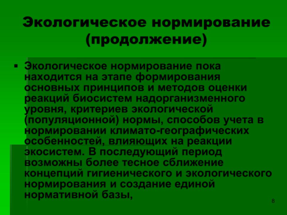 находится на этапе формирования основных принципов и методов оценки реакций биосистем надорганизменного уровня, критериев экологической (популяционной) нормы, способов учета в нормировании климато-географических особенностей, влияющих на реакции экосистем. В последующий период возможны более тесное сближение концепций гигиенического и экологического нормирования и создание единой