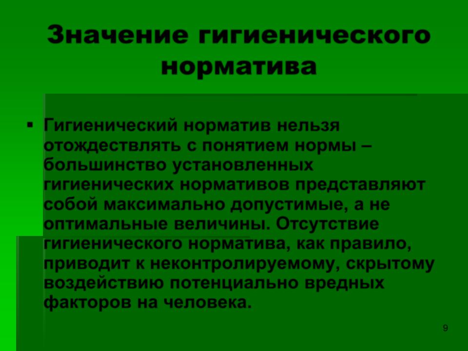 ▪Гигиенический норматив нельзя отождествлять с понятием нормы – большинство установленных гигиенических нормативов представляют собой максимально допустимые, а не оптимальные величины. Отсутствие гигиенического норматива, как правило, приводит к неконтролируемому, скрытому воздействию потенциально вредных факторов на человека.