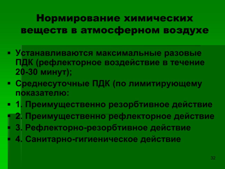▪Устанавливаются максимальные разовые ПДК (рефлекторное воздействие в течение 20-30 минут);