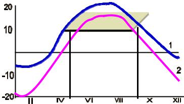 Суточные амплитуды колебания температур сезонов, характеризующихся наибольшей активностью колебаний в зимний сезон, а летние сезоны характеризуются относительно стабильным диапазоном колебаний температур воздуха. Продолжительность физиологически комфортного периода со среднесуточными температурами выше 10-12ºС (когда днем от 16-18ºС и выше) составляет 3,0 – 3,5 месяца, с мая и до августа, лишь в первой декаде этого периода, температуры воздуха иногда не достигают физиологически комфортных значений [37,38].