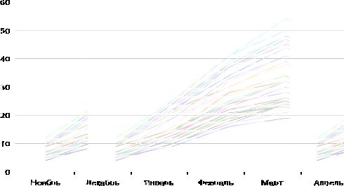 Рис. 2.10. Дин амика снегонакопления за ряд зим на различных типах подстилающей поверхности территории Нижегородской области, см.