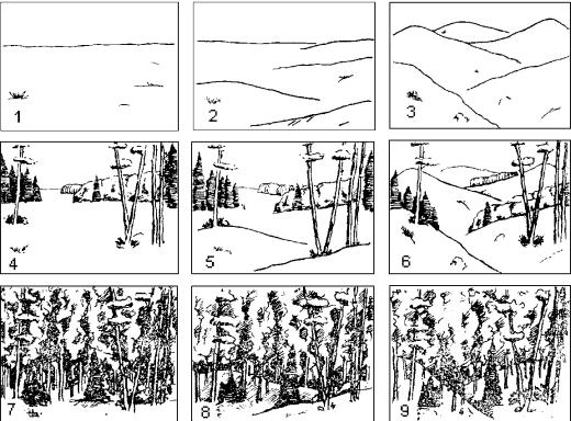 Рис. 4.7. Эталоны эстетической оценки ландшафта по разнообразию рельефа и растительности. Оценка в баллах: 1 – 0; 2 – 4; 3 – 8; 4 – 10; 5