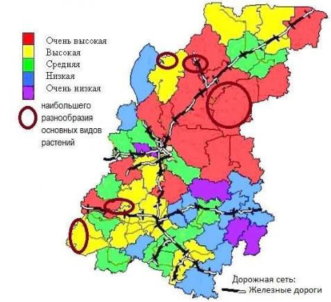 Рис. 4.8. Сохранность и разнообразие основных видов растительности территорий административных районов Нижегородской области