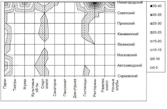 Пространственно– количественные показатели основных туристскорекреационных ресурсов территории на примере города Нижнего Новгорода отражены в тематической модели, построенной на основе административного деления города (рис. 5.4).